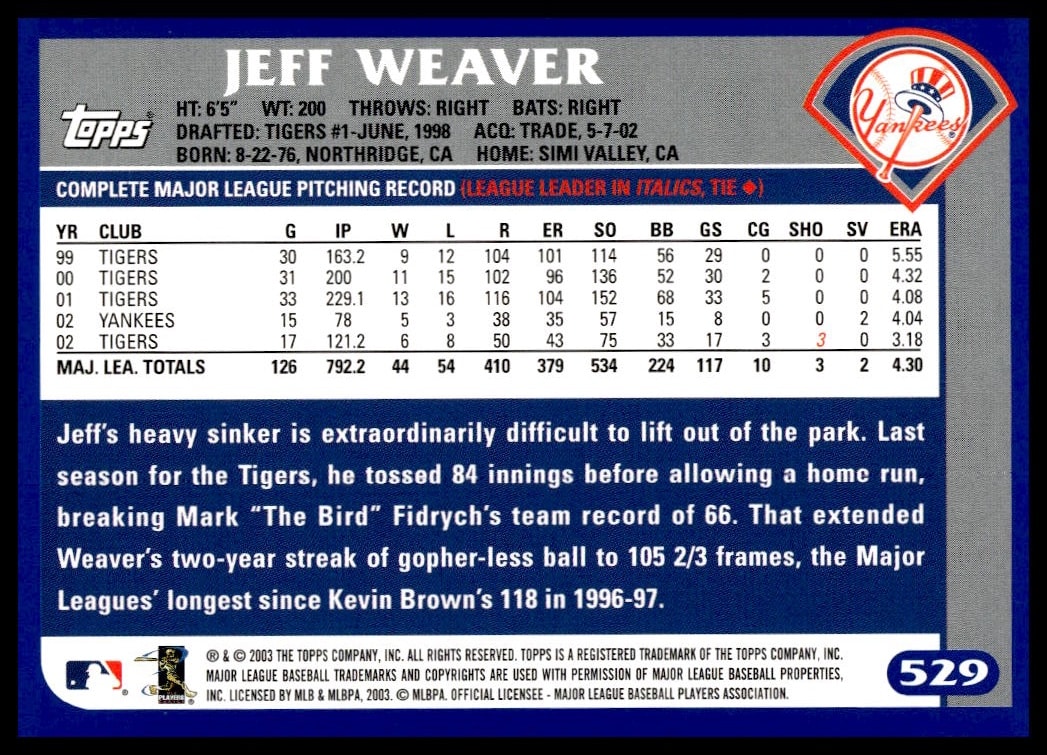 This Baseball card, from 2003 is part of the Topps  card set. Jeff Weaver is featured and has a card number of 529.