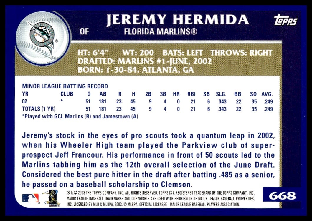 This Baseball card, from 2003 is part of the Topps  card set. Jeremy Hermida is featured and has a card number of 668.