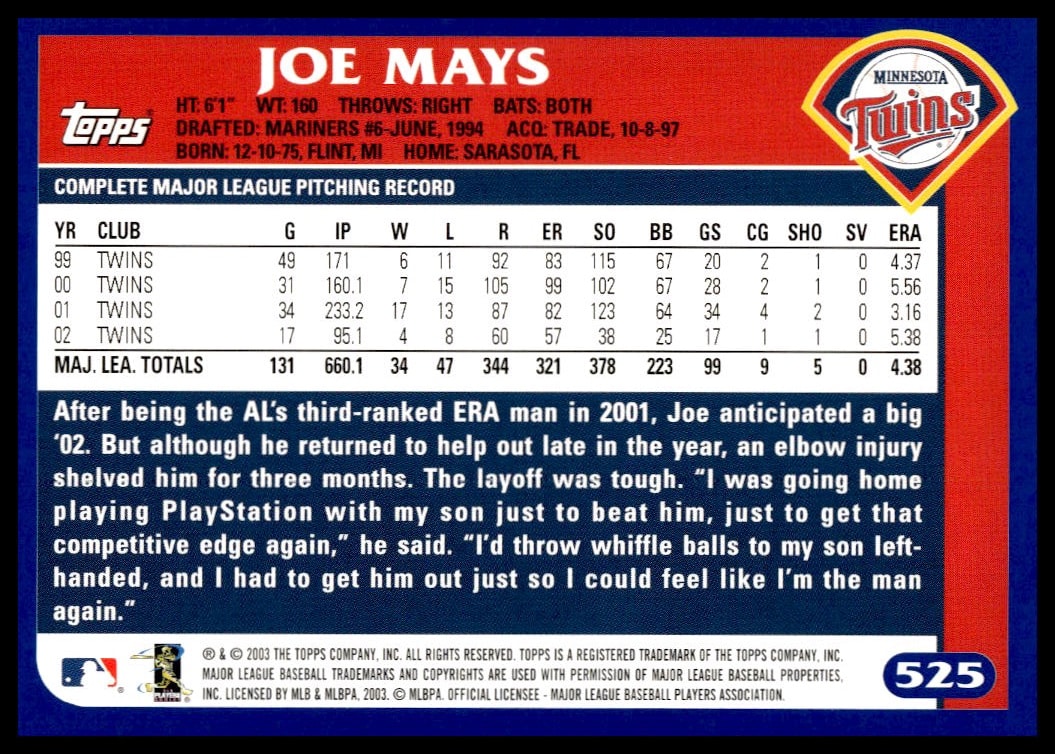 This Baseball card, from 2003 is part of the Topps  card set. Joe Mays is featured and has a card number of 525.