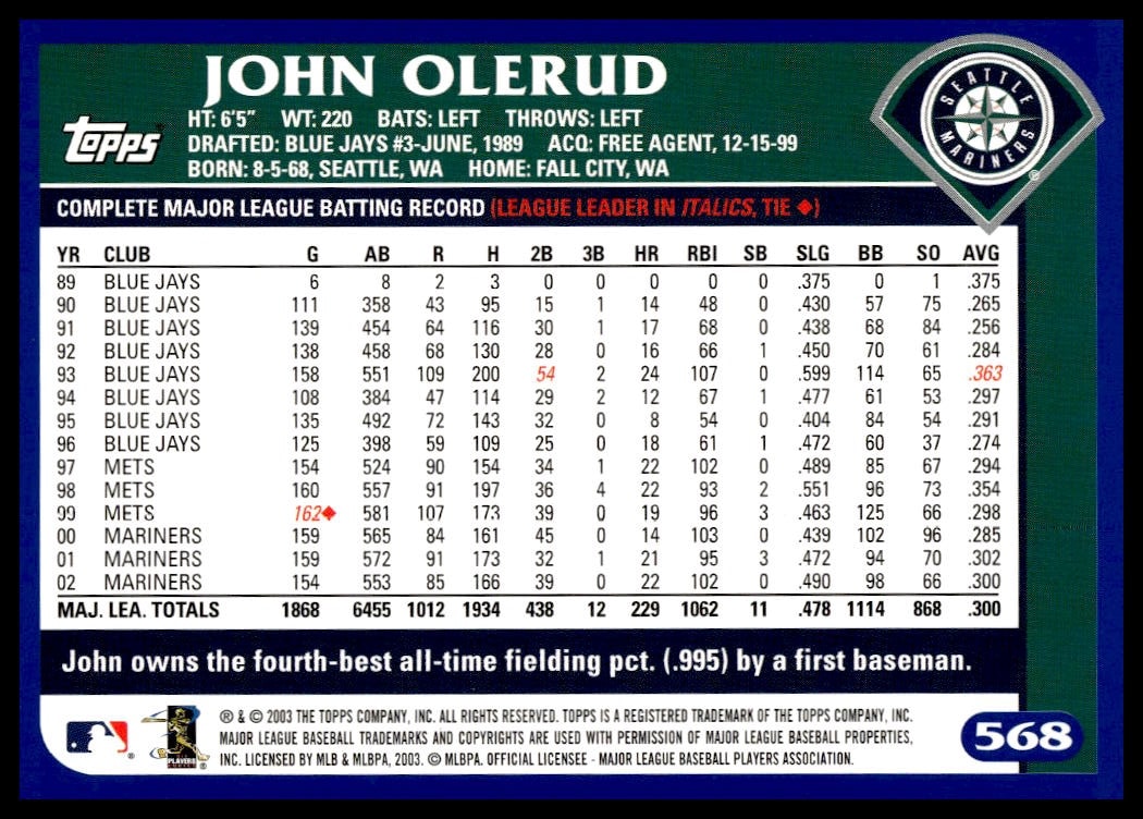 This Baseball card, from 2003 is part of the Topps  card set. John Olerud is featured and has a card number of 568.
