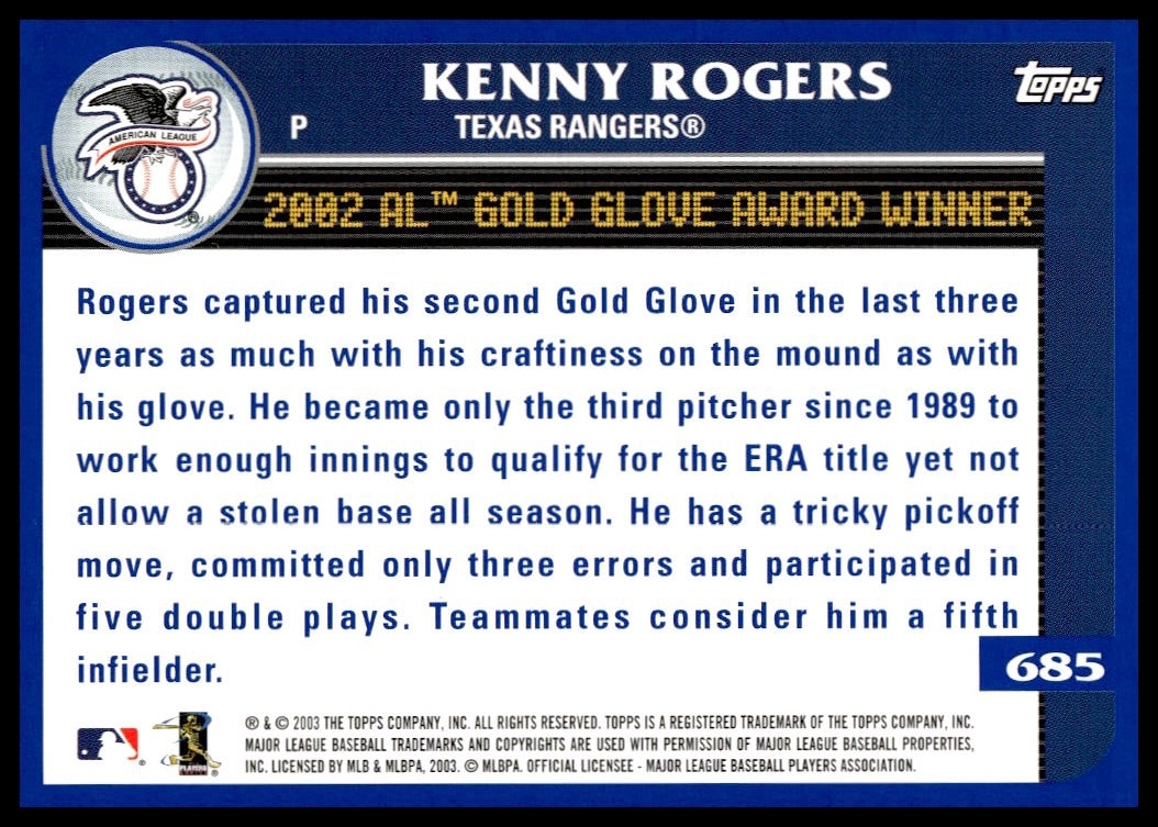 This Baseball card, from 2003 is part of the Topps  card set. Kenny Rogers is featured and has a card number of 685.
