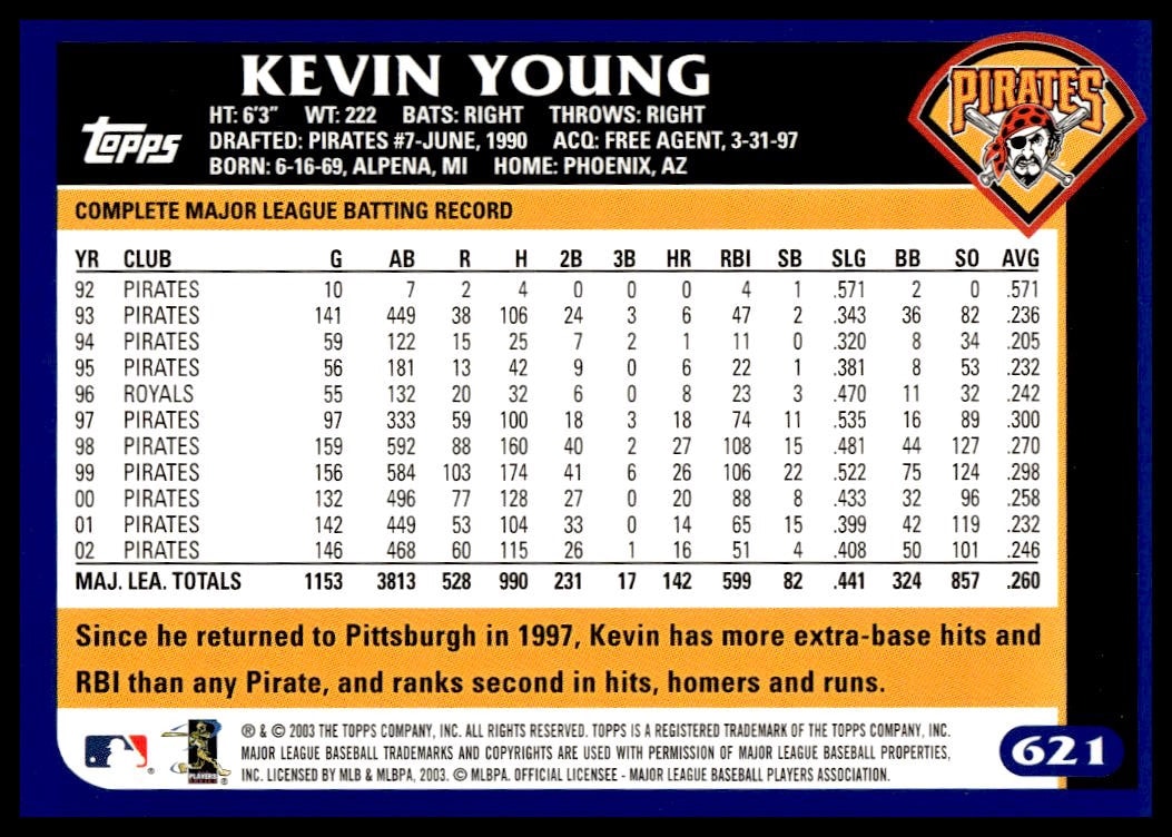 This Baseball card, from 2003 is part of the Topps  card set. Kevin Young is featured and has a card number of 621.