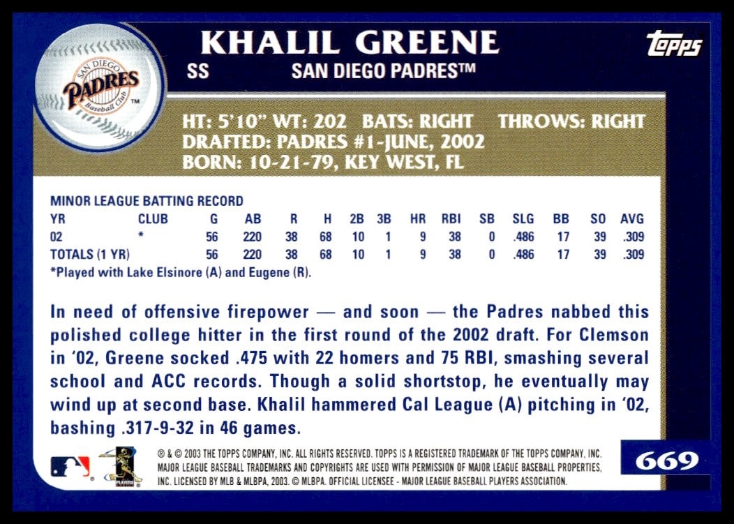 This Baseball card, from 2003 is part of the Topps  card set. Khalil Greene is featured and has a card number of 669.
