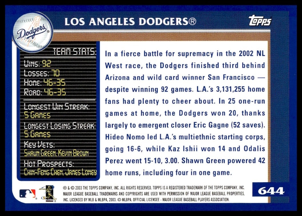 2003 Topps Los Angeles Dodgers #644