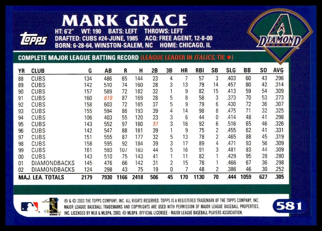 This Baseball card, from 2003 is part of the Topps  card set. Mark Grace is featured and has a card number of 581.