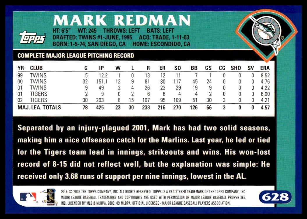 This Baseball card, from 2003 is part of the Topps  card set. Mark Redman is featured and has a card number of 628.