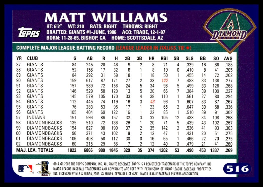 This Baseball card, from 2003 is part of the Topps  card set. Matt Williams is featured and has a card number of 516.