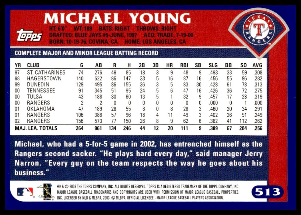 This Baseball card, from 2003 is part of the Topps  card set. Michael Young is featured and has a card number of 513.