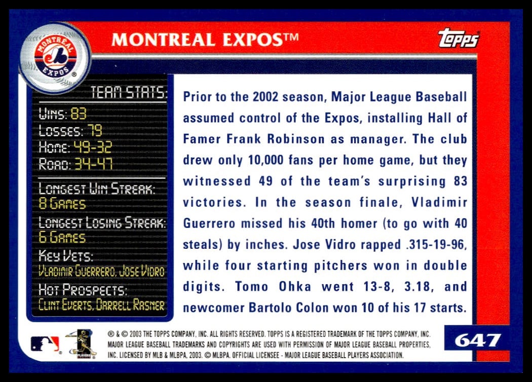 This Baseball card, from 2003 is part of the Topps  card set. Montreal Expos is featured and has a card number of 647.