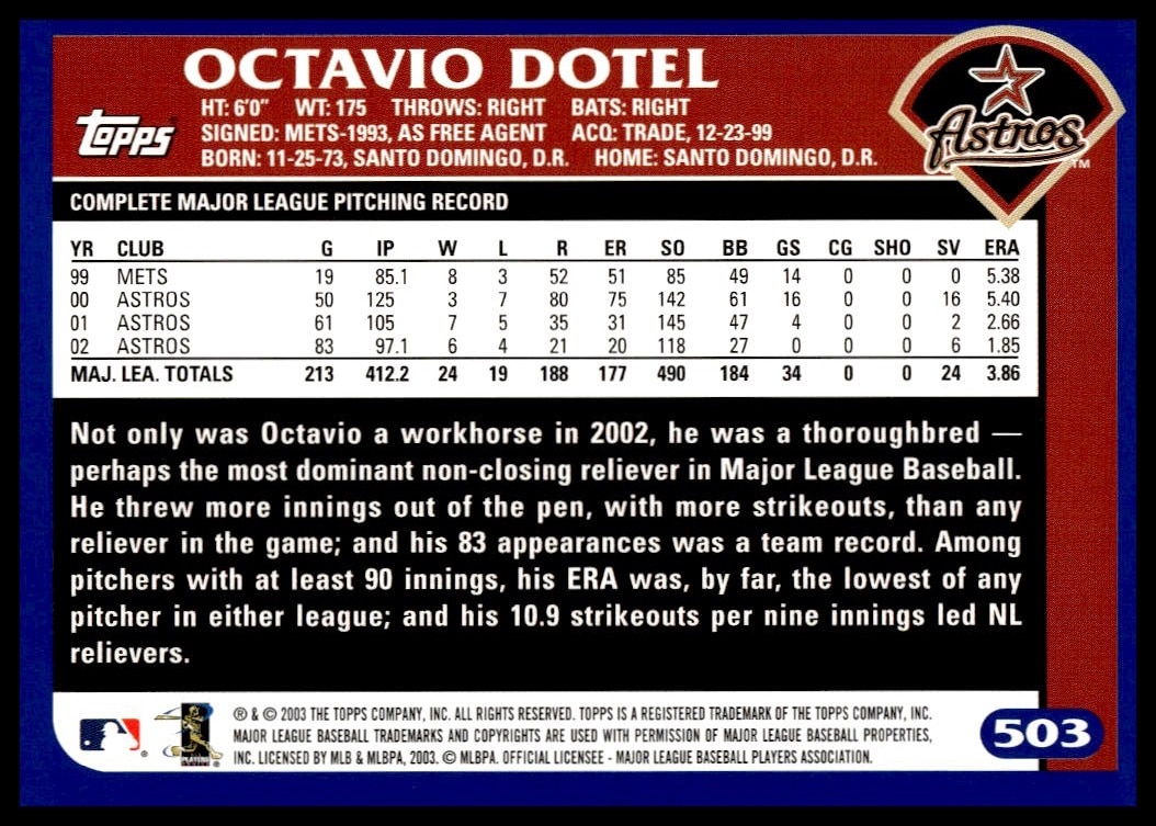 This Baseball card, from 2003 is part of the Topps  card set. Octavio Dotel is featured and has a card number of 503.