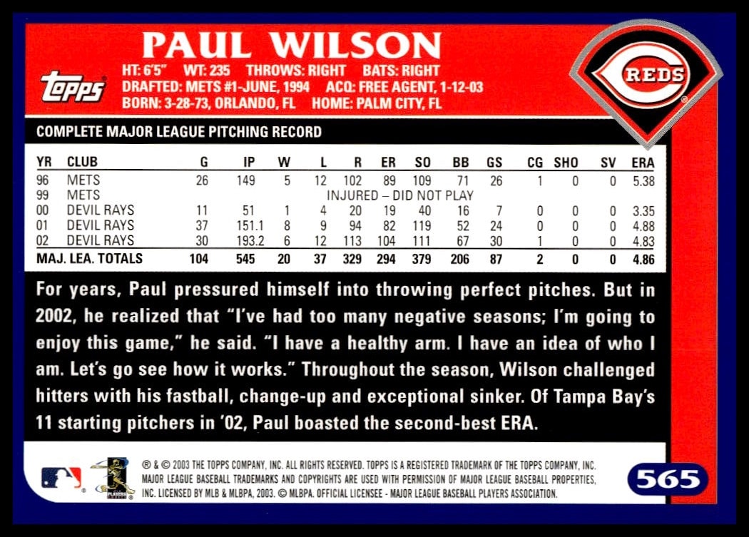 This Baseball card, from 2003 is part of the Topps  card set. Paul Wilson is featured and has a card number of 565.