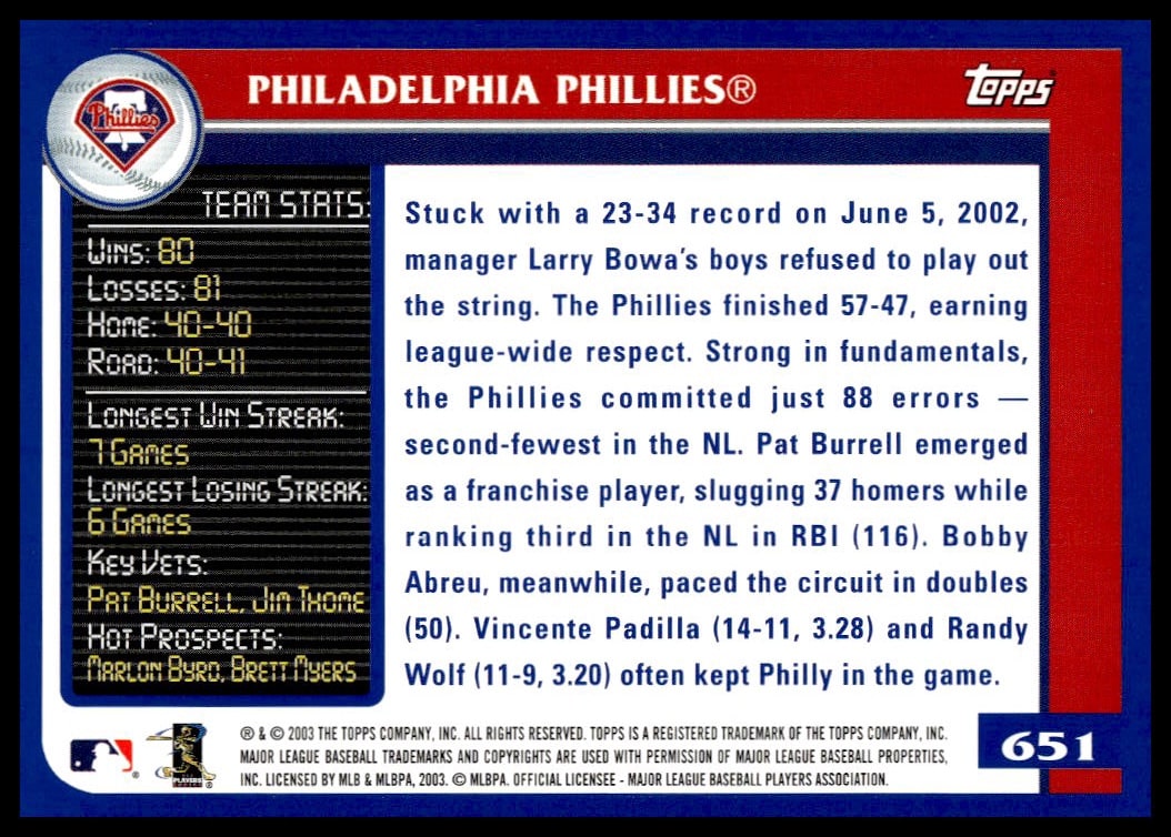 This BaseballΒ card, from 2003 is part of the Topps Β card set. Philadelphia Phillies is featured and has a card number of 651.