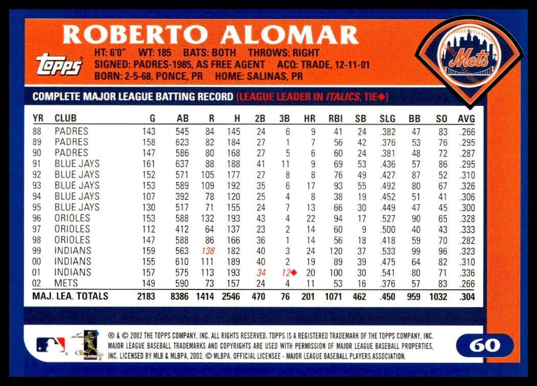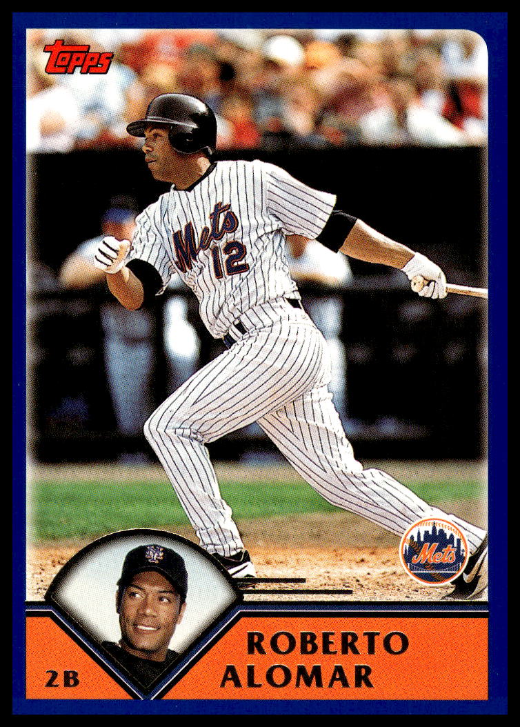 This Baseball card, from 2003 is part of the Topps  card set. Roberto Alomar is featured and has a card number of 55.