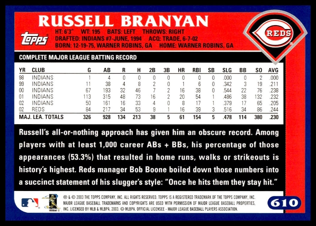 This Baseball card, from 2003 is part of the Topps  card set. Russell Branyan is featured and has a card number of 610.