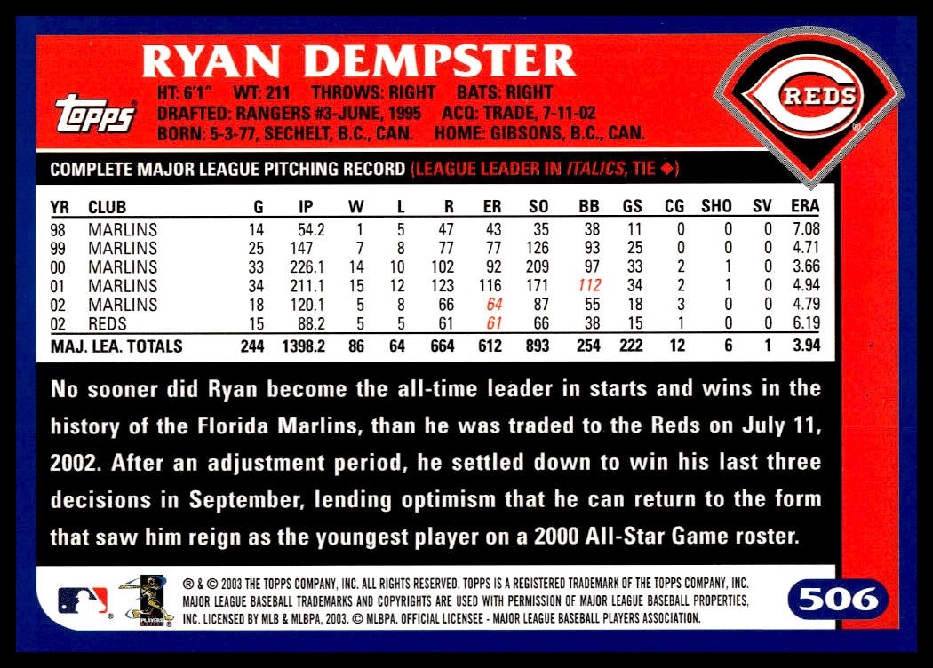 This Baseball card, from 2003 is part of the Topps  card set. Ryan Dempster is featured and has a card number of 506.