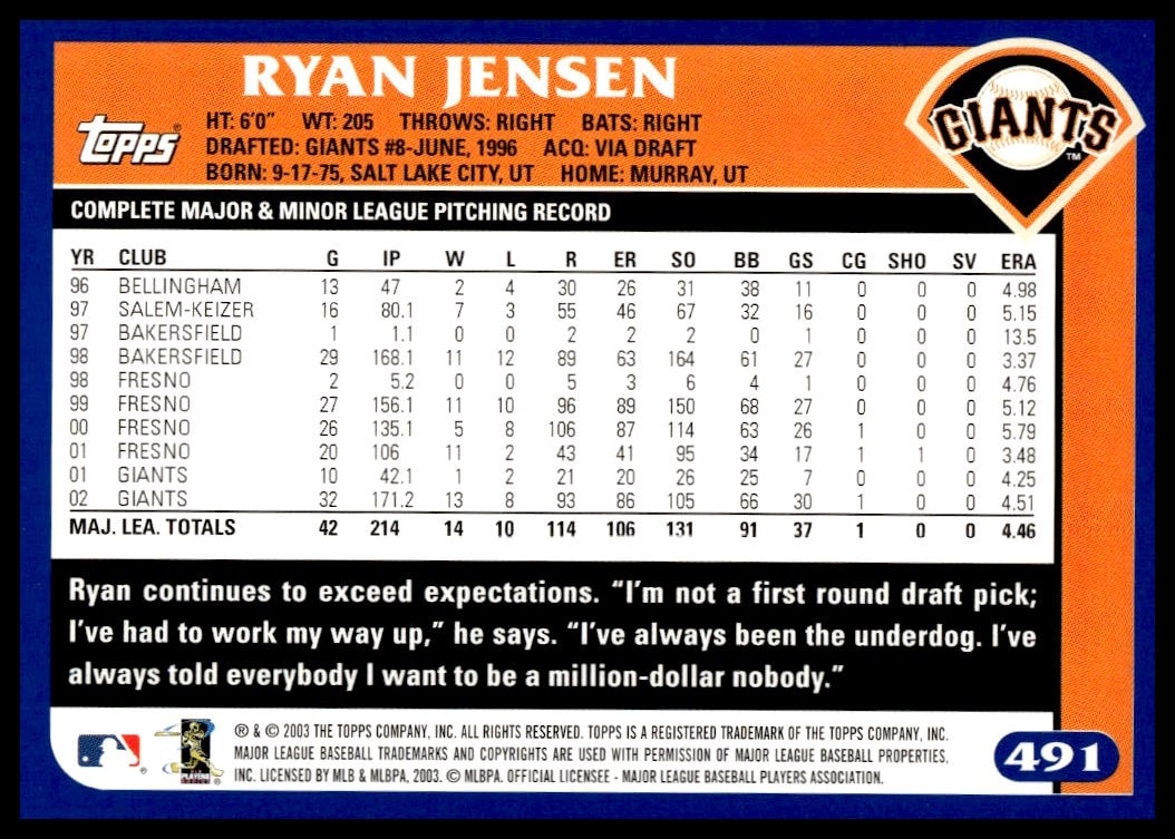 This Baseball card, from 2003 is part of the Topps  card set. Ryan Jensen is featured and has a card number of 491.