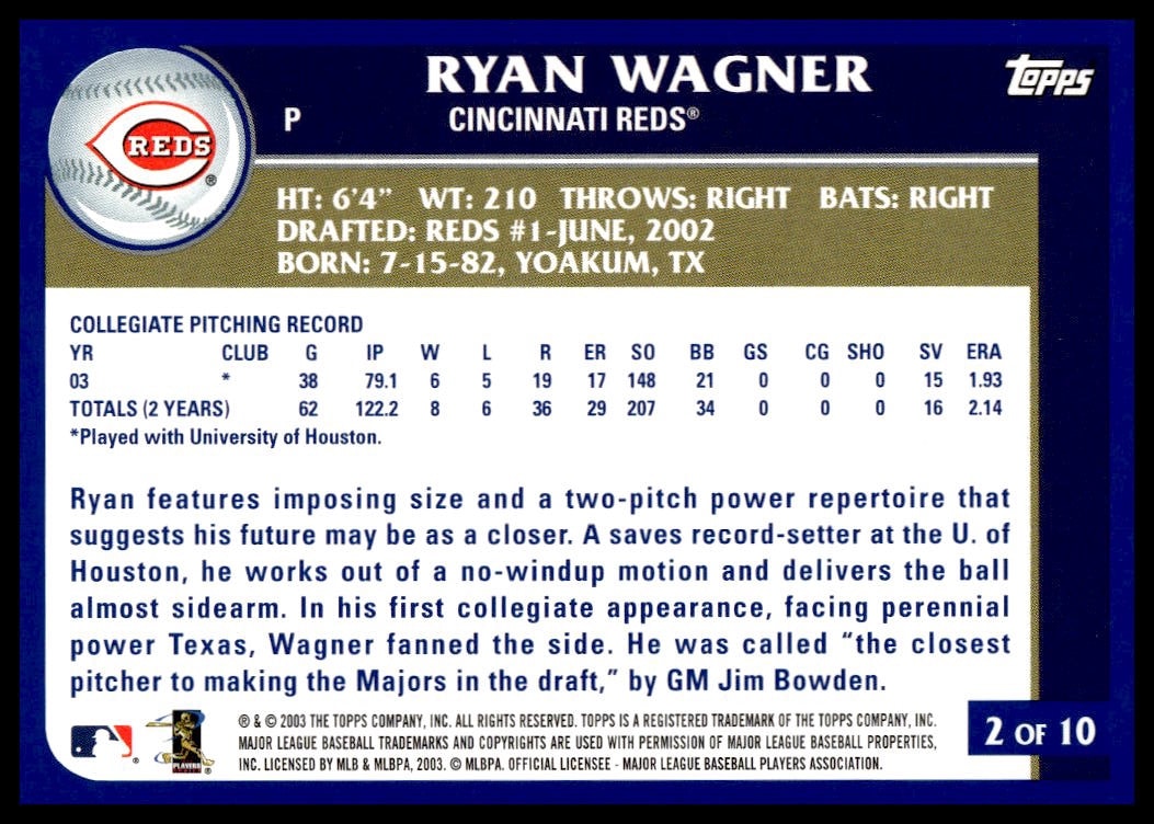 This Baseball card, from 2003 is part of the Topps  card set. Ryan Wagner is featured and has a card number of 2b.