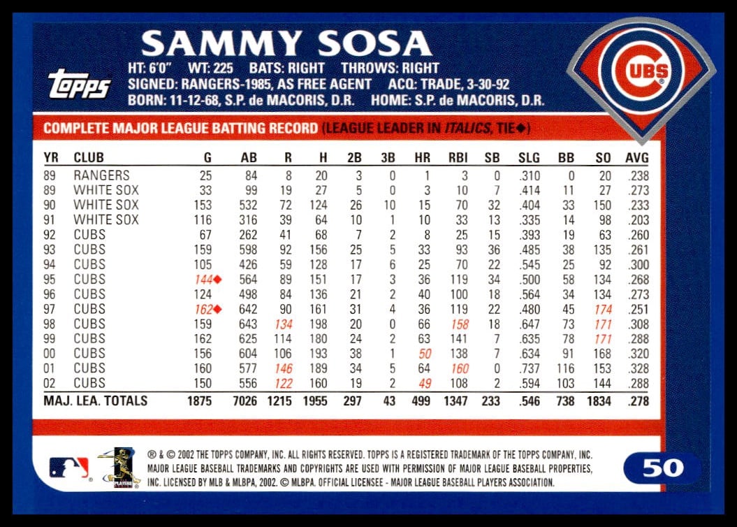 This Baseball card, from 2003 is part of the Topps  card set. Sammy Sosa is featured and has a card number of 30.
