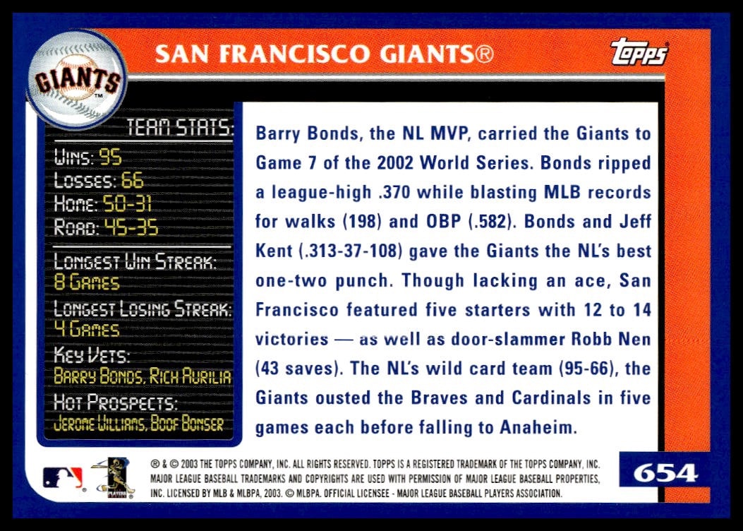 This Baseball card, from 2003 is part of the Topps  card set. San Francisco Giants is featured and has a card number of 654.