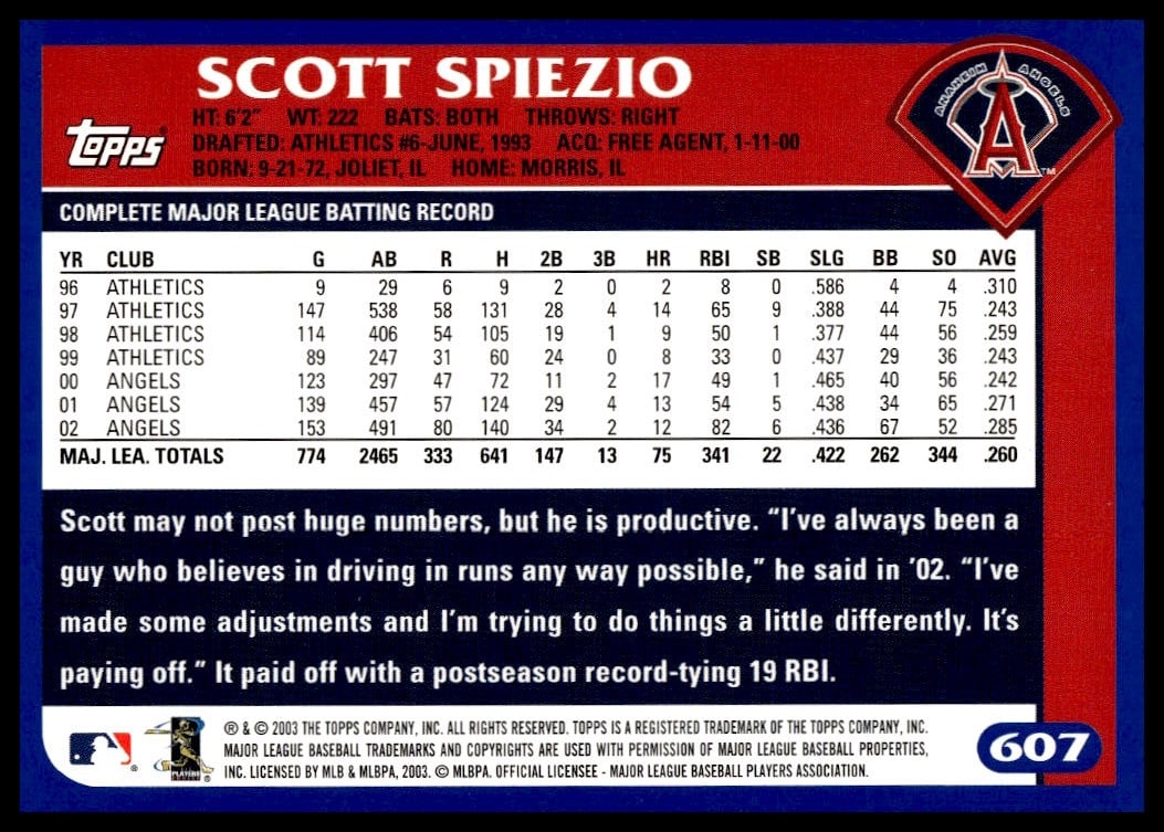 This Baseball card, from 2003 is part of the Topps  card set. Scott Spiezio is featured and has a card number of 607.