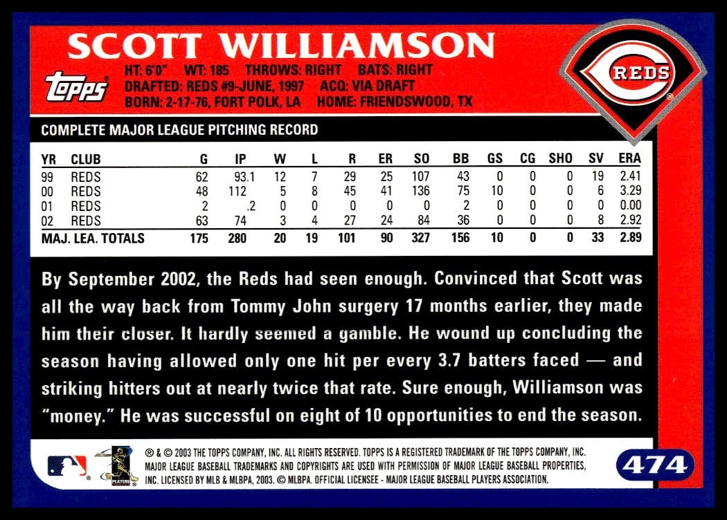 This BaseballΒ card, from 2003 is part of the Topps Β card set. Scott Williamson is featured and has a card number of 474.
