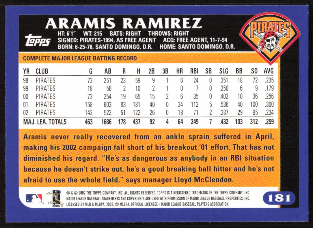 This Baseball card, from 2003 is part of the Topps Series 1 card set. Aramis Ramirez is featured and has a card number of 181.