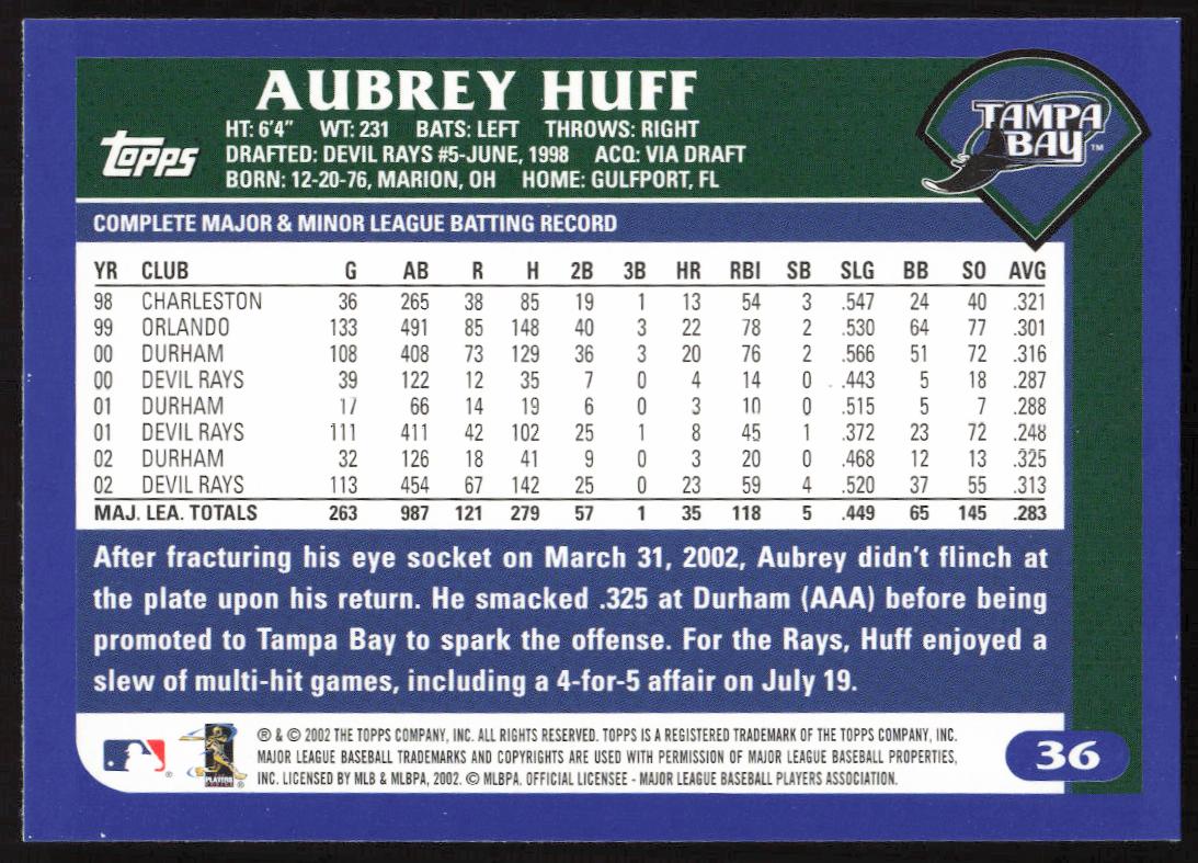 This BaseballΒ card, from 2003 is part of the Topps Series 1Β card set. Aubrey Huff is featured and has a card number of 36.