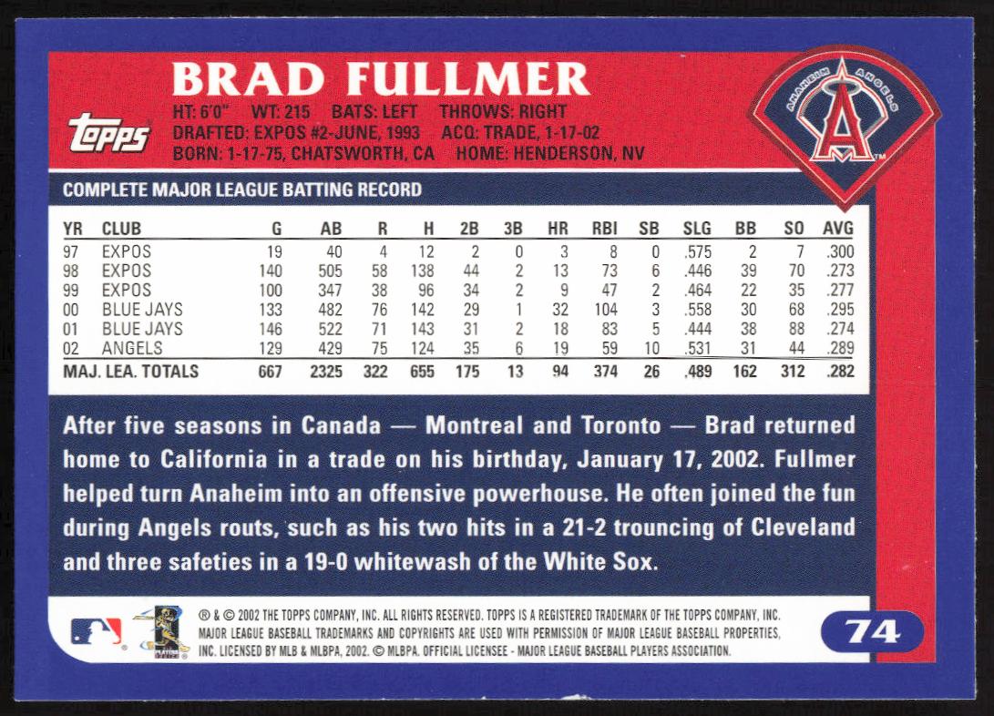 This BaseballΒ card, from 2003 is part of the Topps Series 1Β card set. Brad Fullmer is featured and has a card number of 74.