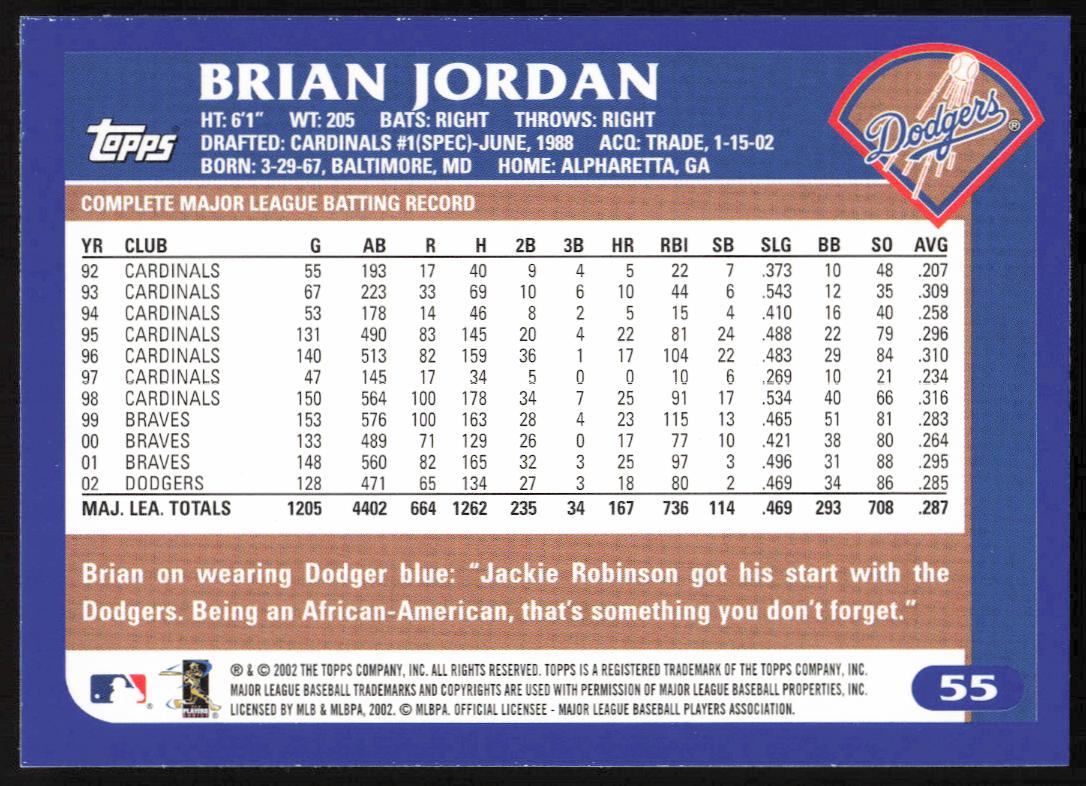 This BaseballΒ card, from 2003 is part of the Topps Series 1Β card set. Brian Jordan is featured and has a card number of 55.
