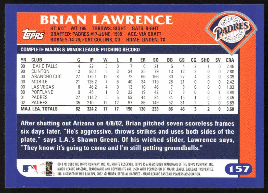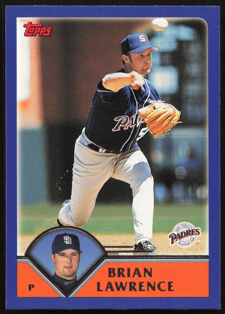 This BaseballΒ card, from 2003 is part of the Topps Series 1Β card set. Brian Lawrence is featured and has a card number of 157.