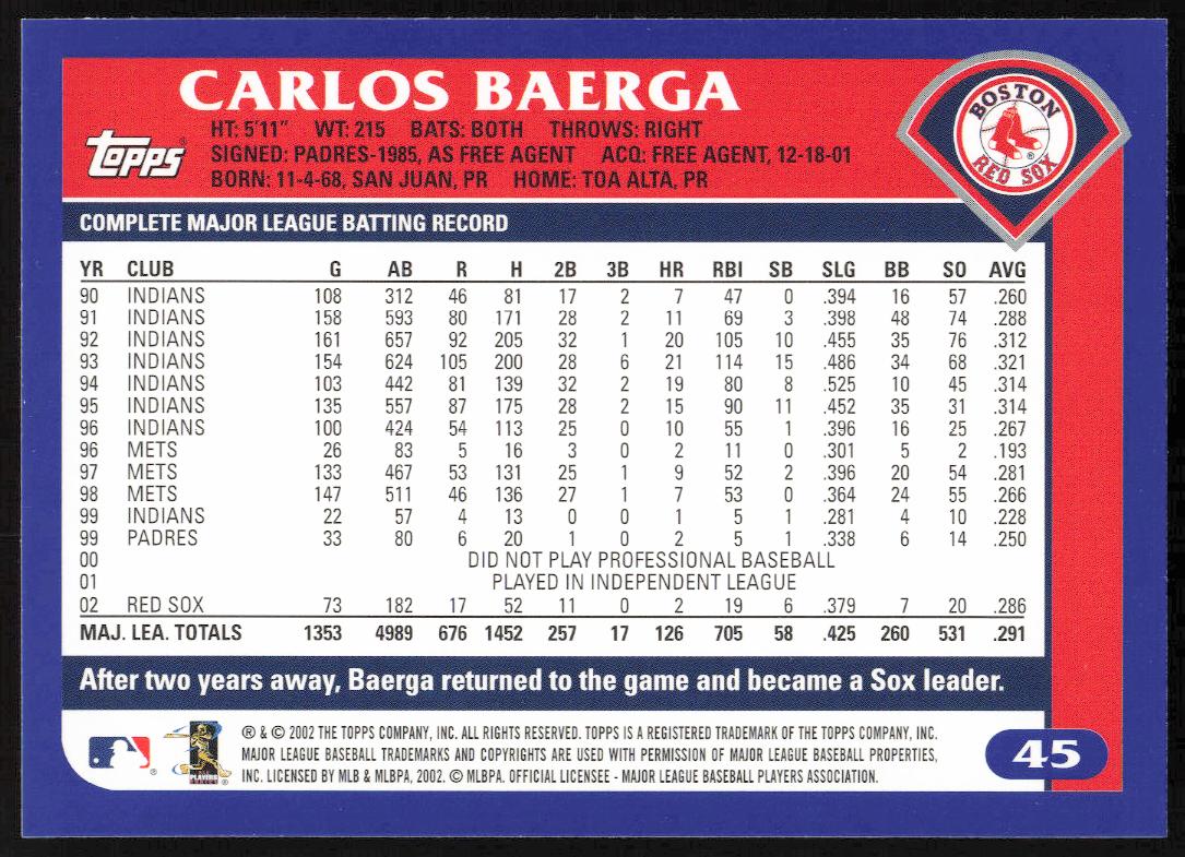 This Baseball card, from 2003 is part of the Topps Series 1 card set. Carlos Baerga is featured and has a card number of 45.
