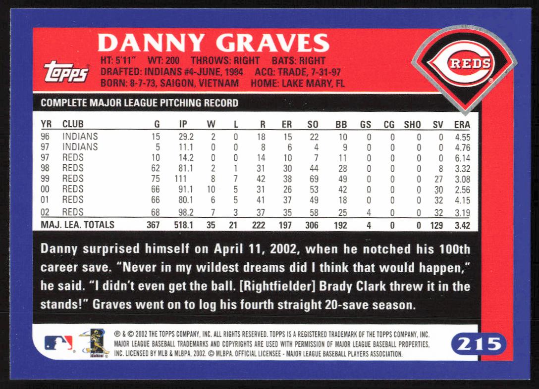 This BaseballΒ card, from 2003 is part of the Topps Series 1Β card set. Danny Graves is featured and has a card number of 215.