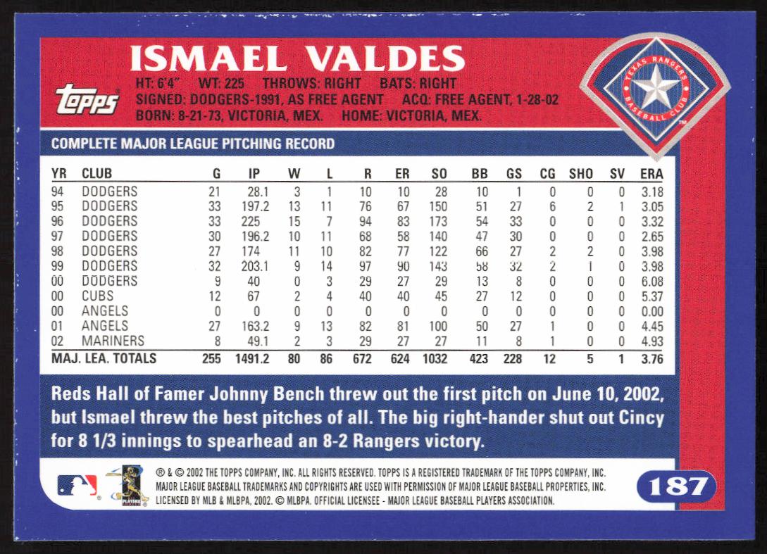 This BaseballΒ card, from 2003 is part of the Topps Series 1Β card set. Ismael Valdes is featured and has a card number of 187.