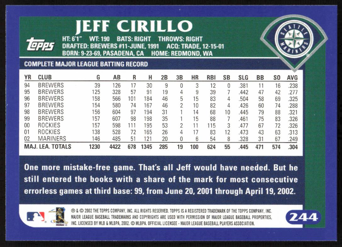 This BaseballΒ card, from 2003 is part of the Topps Series 1Β card set. Jeff Cirillo is featured and has a card number of 244.