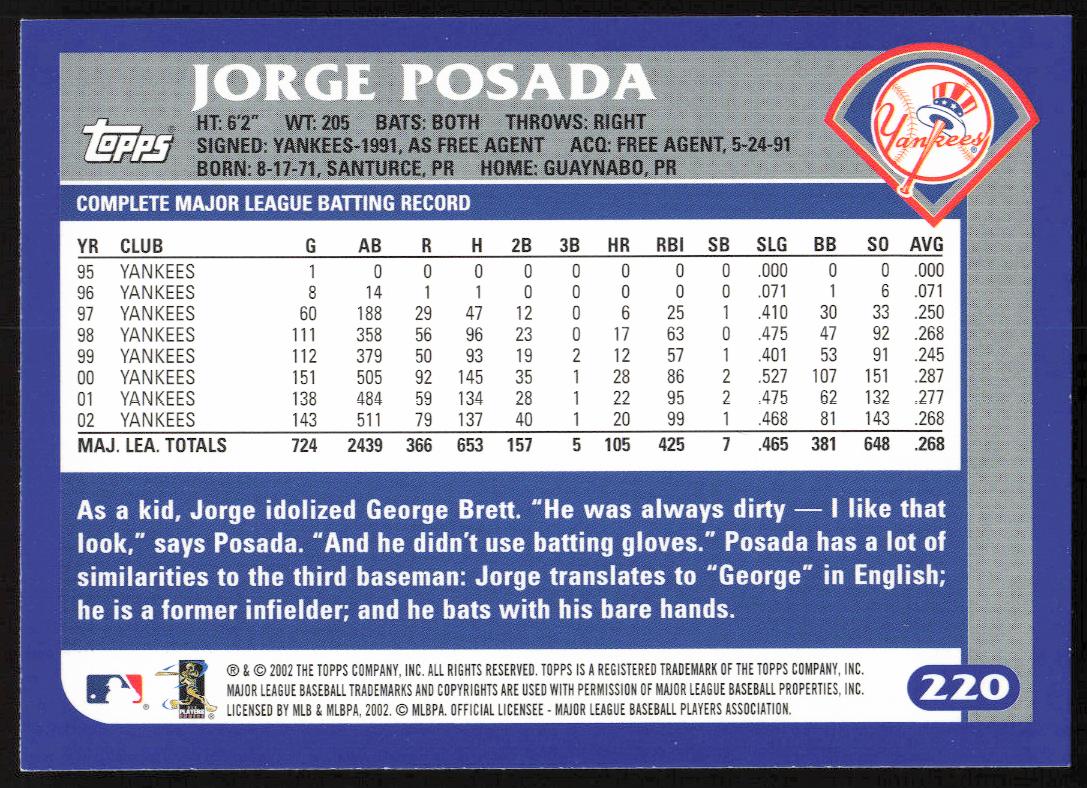 This BaseballΒ card, from 2003 is part of the Topps Series 1Β card set. Jorge Posada is featured and has a card number of 220.