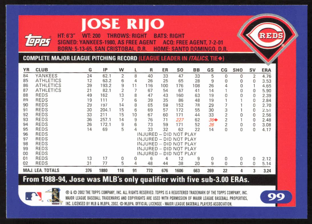 This Baseball card, from 2003 is part of the Topps Series 1 card set. Jose Rijo is featured and has a card number of 99.