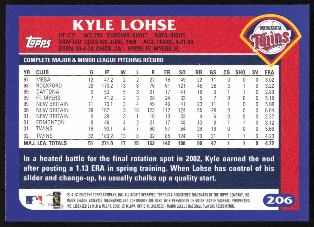 This BaseballΒ card, from 2003 is part of the Topps Series 1Β card set. Kyle Lohse is featured and has a card number of 206.