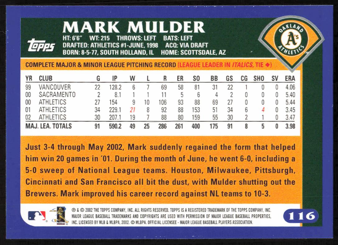 This BaseballΒ card, from 2003 is part of the Topps Series 1Β card set. Mark Mulder is featured and has a card number of 116.
