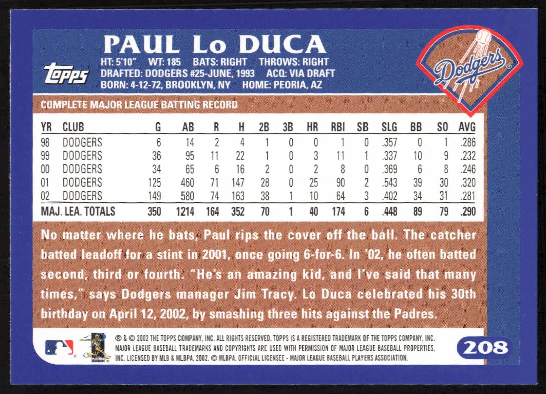 This BaseballΒ card, from 2003 is part of the Topps Series 1Β card set. Paul Lo Duca is featured and has a card number of 208.