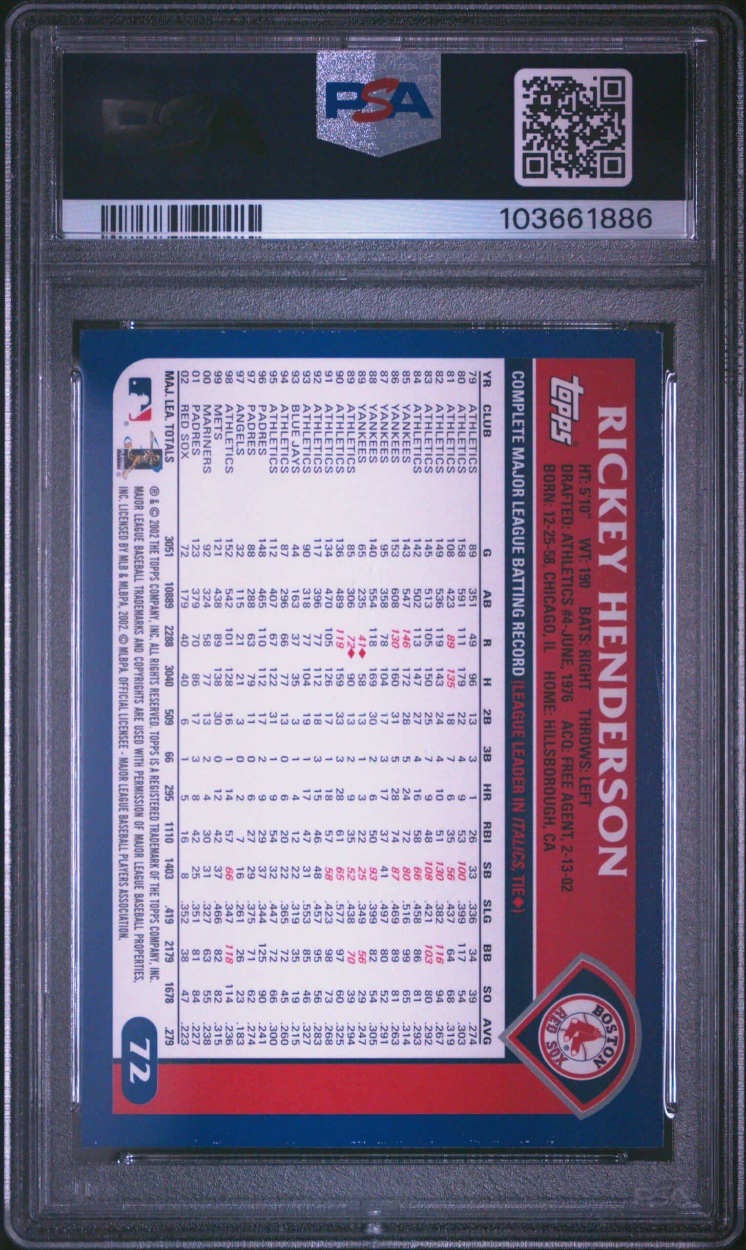 2003 Topps Series 1 Rickey Henderson card #72 in PSA 7 condition, perfect for collectors and fans of baseball memorabilia.