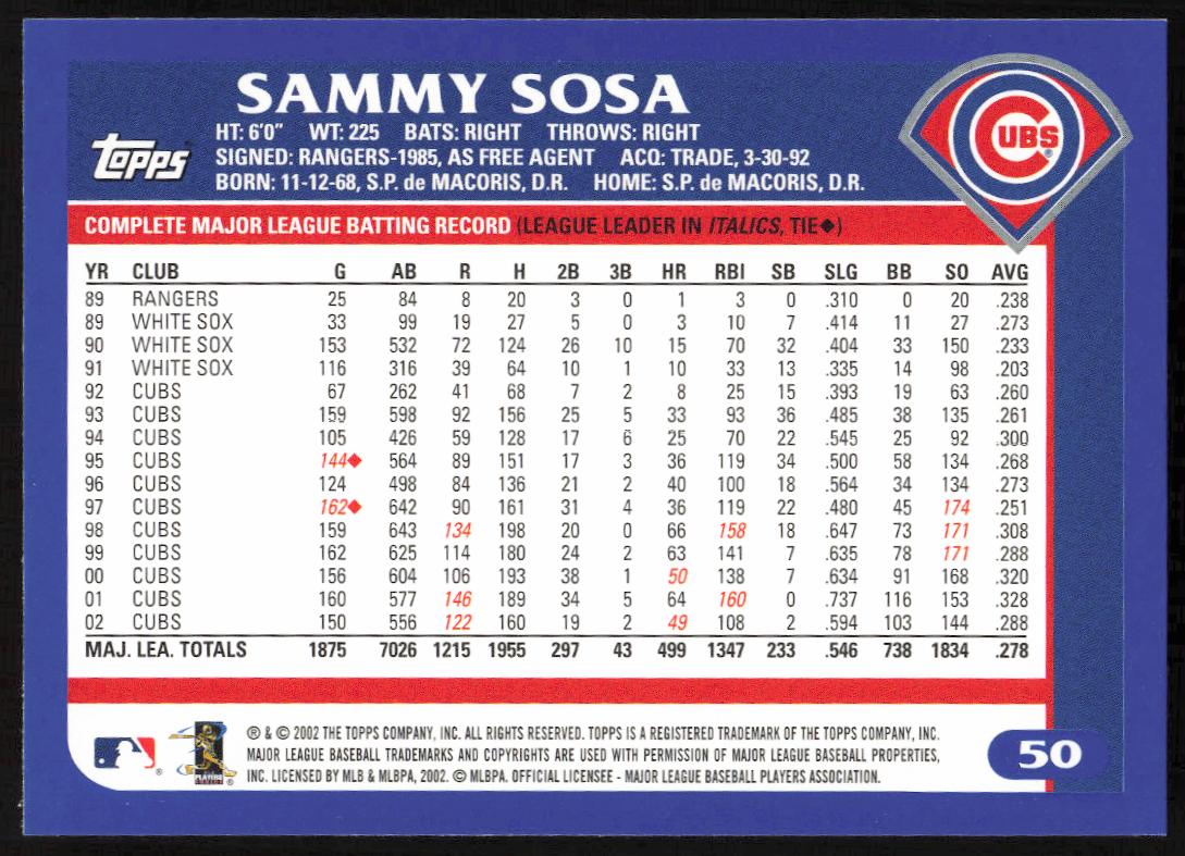 This BaseballΒ card, from 2003 is part of the Topps Series 1Β card set. Sammy Sosa is featured and has a card number of 50.