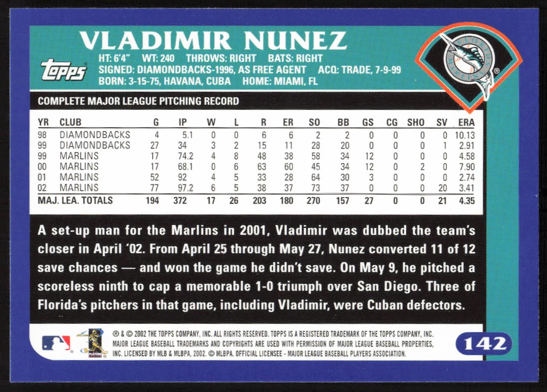 This BaseballΒ card, from 2003 is part of the Topps Series 1Β card set. Vladimir Nunez is featured and has a card number of 142.