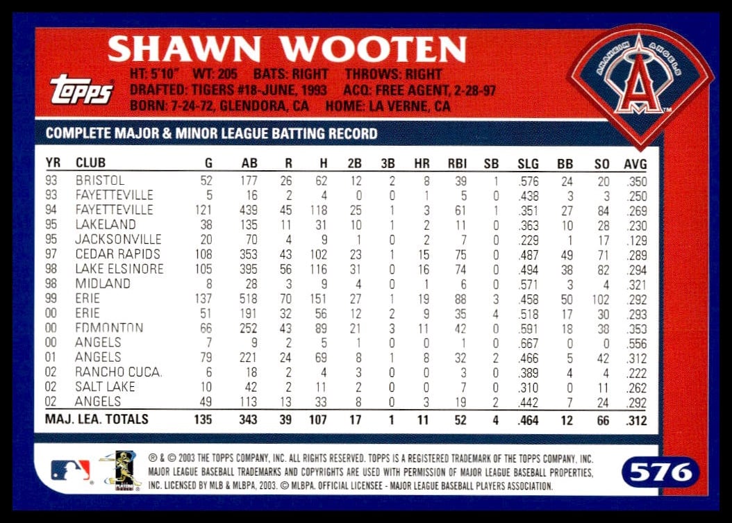 This Baseball card, from 2003 is part of the Topps  card set. Shawn Wooten is featured and has a card number of 576.