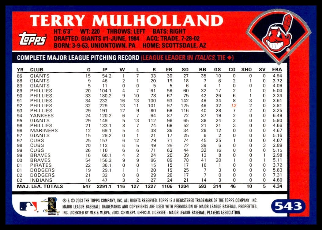 This Baseball card, from 2003 is part of the Topps  card set. Terry Mulholland is featured and has a card number of 543.