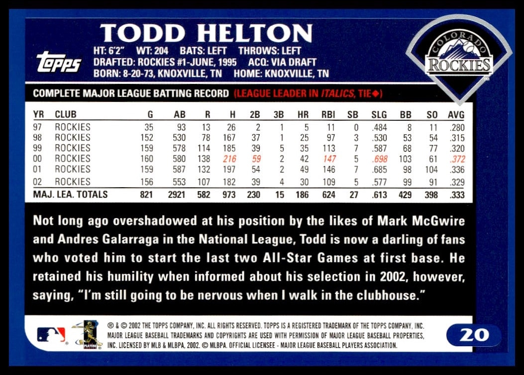 This Baseball card, from 2003 is part of the Topps  card set. Todd Helton is featured and has a card number of 20.