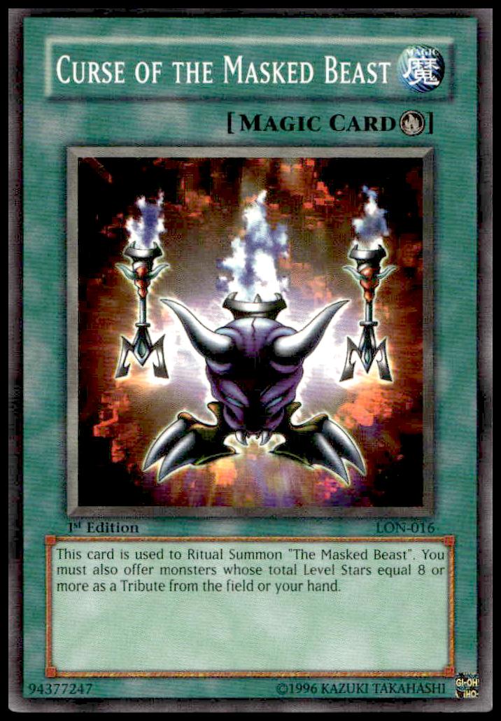 This Yu-Gi-Oh card, from 2003 is part of the Yu-Gi-Oh! Labyrinth of Nightmare (1st Edition) card set. Curse of the Masked Beast is featured and has a card number of LON-EN016.
