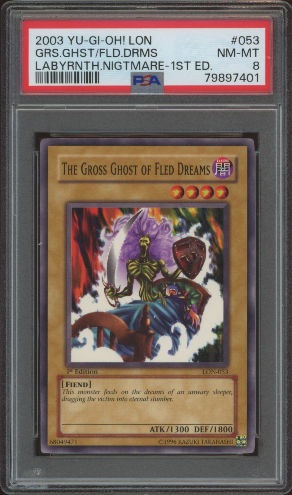 This card, from 2003 is part of the Yu-Gi-Oh! Labyrinth of Nightmare (1st Edition) card set. The Gross Ghost of Fled Dreams is featured and has a card number of LON-053. It is graded by PSA and has a numeric grade of 8.