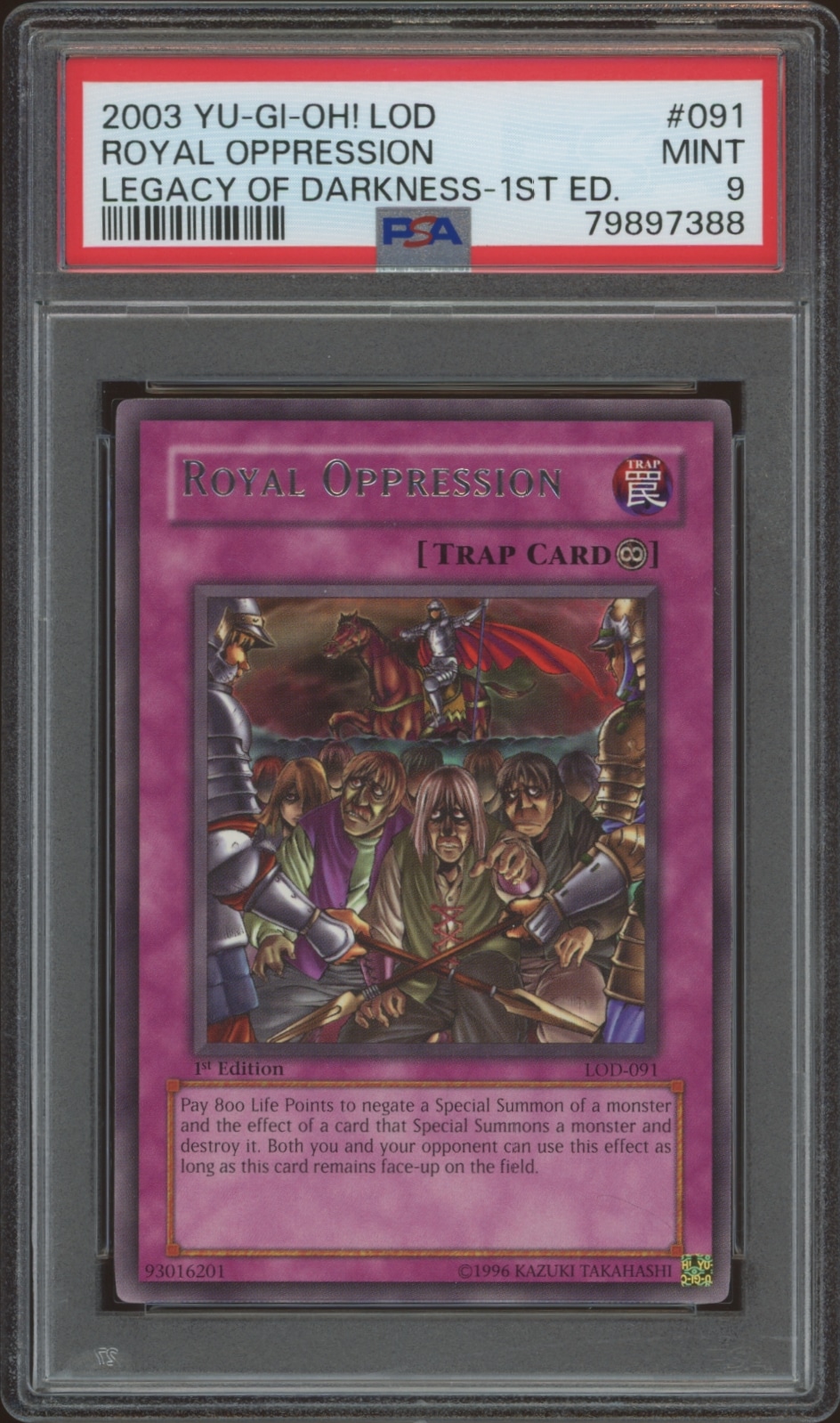 This card, from 2003 is part of the Yu-Gi-Oh! Legacy of Darkness (1st Edition) card set. Royal Oppression is featured and has a card number of LOD-091. It is graded by PSA and has a numeric grade of 9.