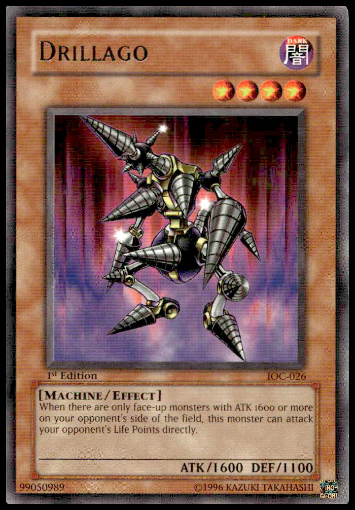 This Yu-Gi-Oh card, from 2004 is part of the Yu-Gi-Oh! Invasion of Chaos (1st Edition) card set. Drillago is featured and has a card number of IOC-026.