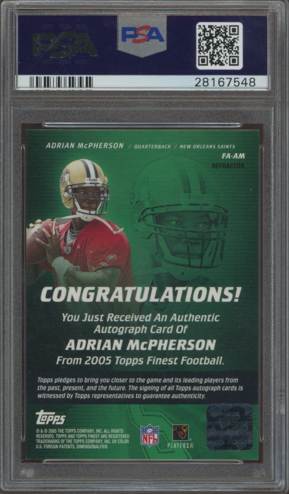 This Football card, from 2005 is part of the Topps Finest card set. Adrian McPherson is featured and has a card number of FA-AM. It is graded by PSA and has a numeric grade of 10.